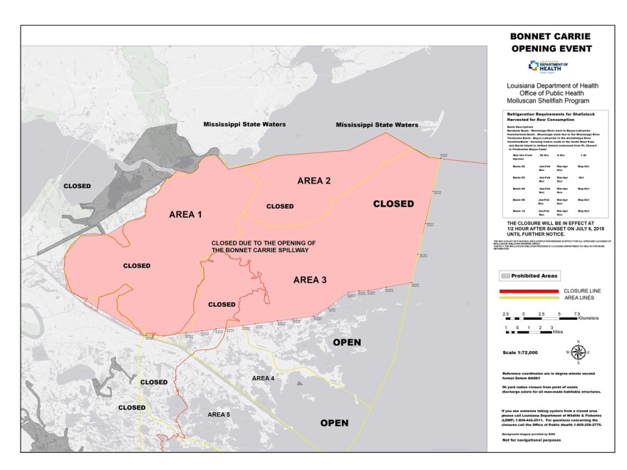 Louisiana’s Department of Health is shutting down several oyster harvesting areas due to low salinity caused by a steady influx of freshwater from the Bonnet Carre Spillway.