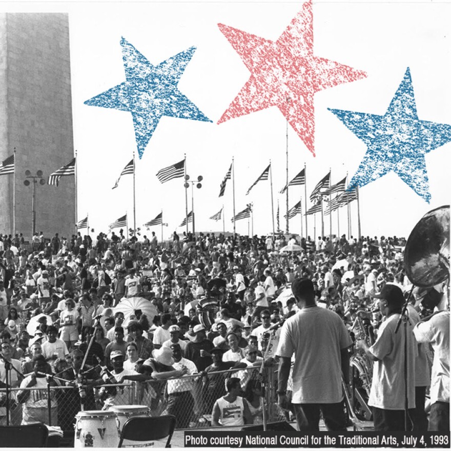 Nick Spitzer: Onstage at the Washington Monument in 1993 with members of the late bandleader Bob Wills’ Texas Playboys including singer Leon Rauch, fiddler Johnny Gimble, Herb Remington steel guitar and the rest of the band.
